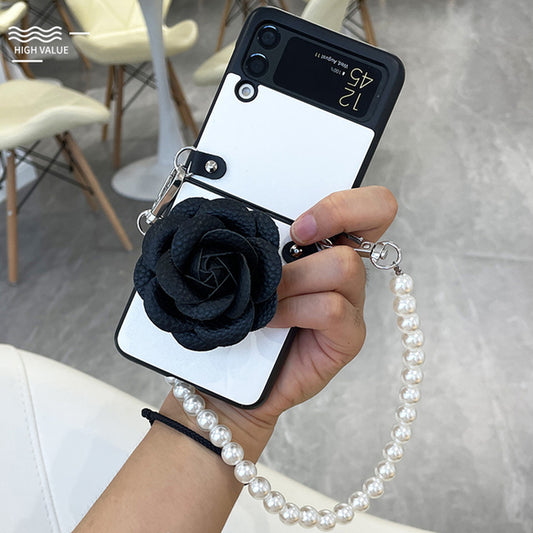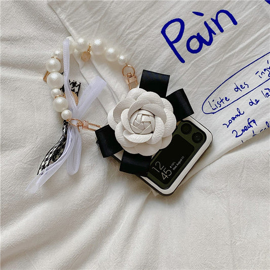 Luxury Leather Camellia Elegant Pearl Bracelet Phone Case For Samsung Galaxy Z Flip 3