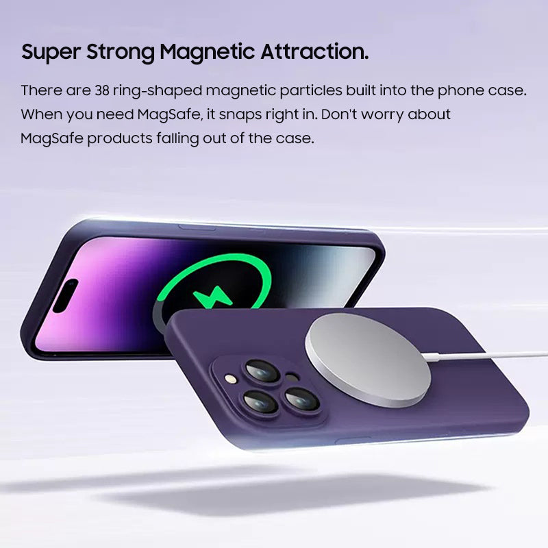 This case is designed with liquid silicone, which is soft to the touch and offers great grip. The lining is made of soft microfiber to protect your phone. Built-in magnets provide MagSafe fast wireless charging, and with its 38 magnetic beads and strong adhesion, you can enjoy long-term use without worrying about the appearance of the case.