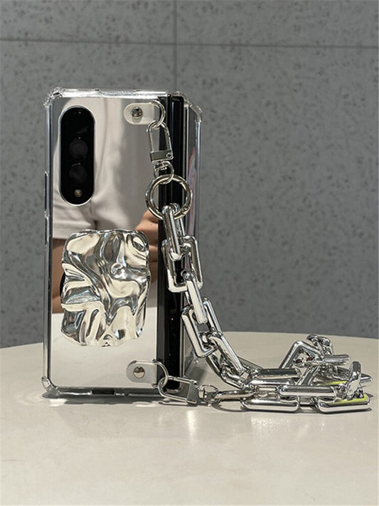 Luxury Mirror Shockproof Case With Silver Wrinkle Holder And Bracelet Chain For Samsung Galaxy Z Fold 3 5G