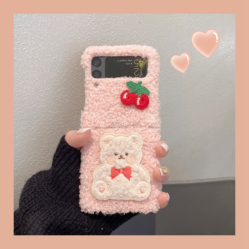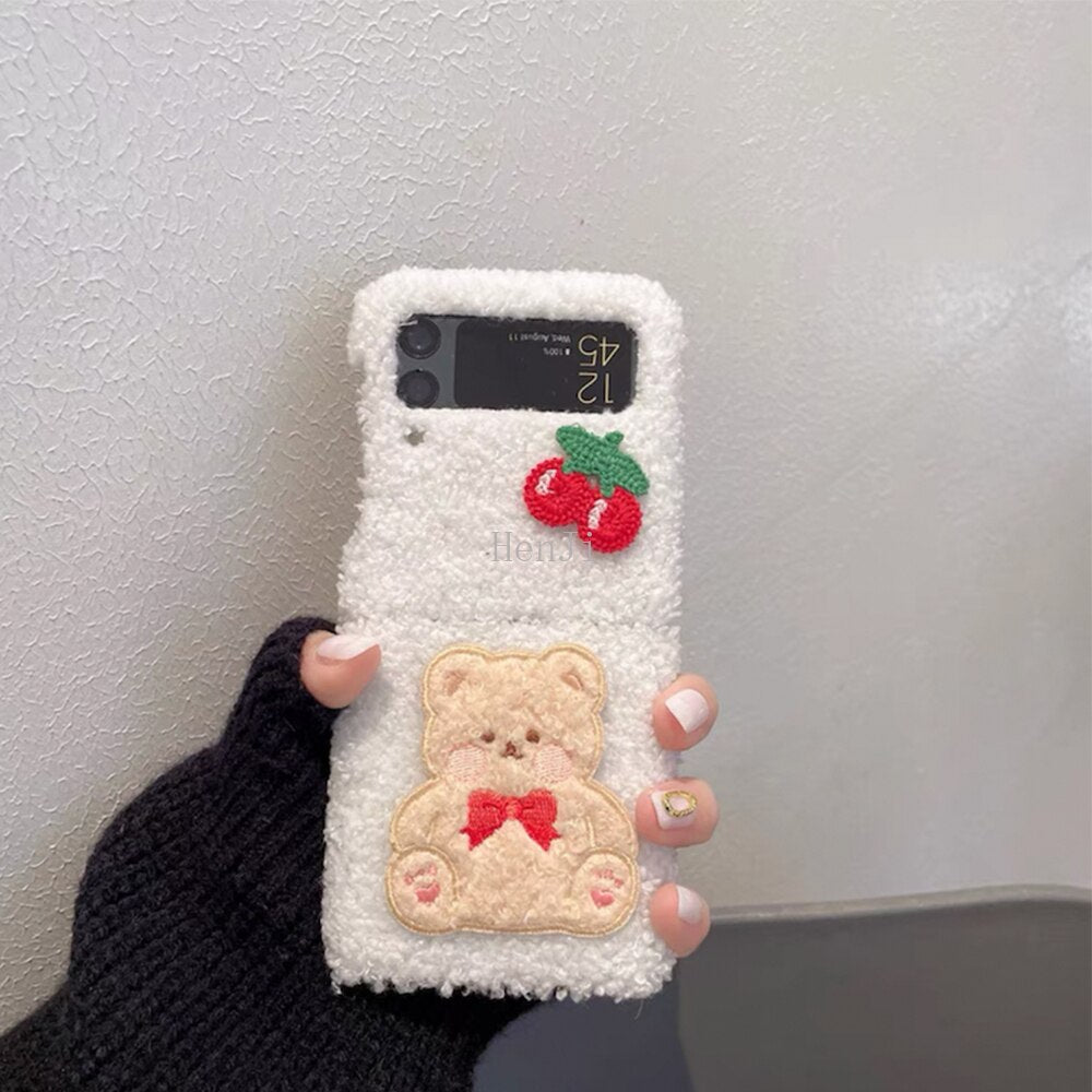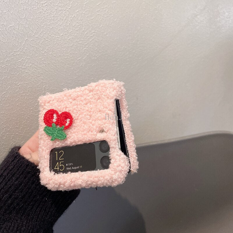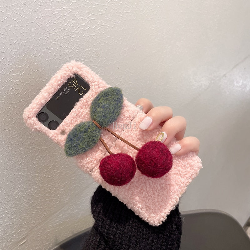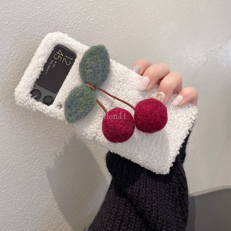 3D Cute Cherry Fur Plush Furry Warm Hard Cases for Samsung Z Flip 3 5g